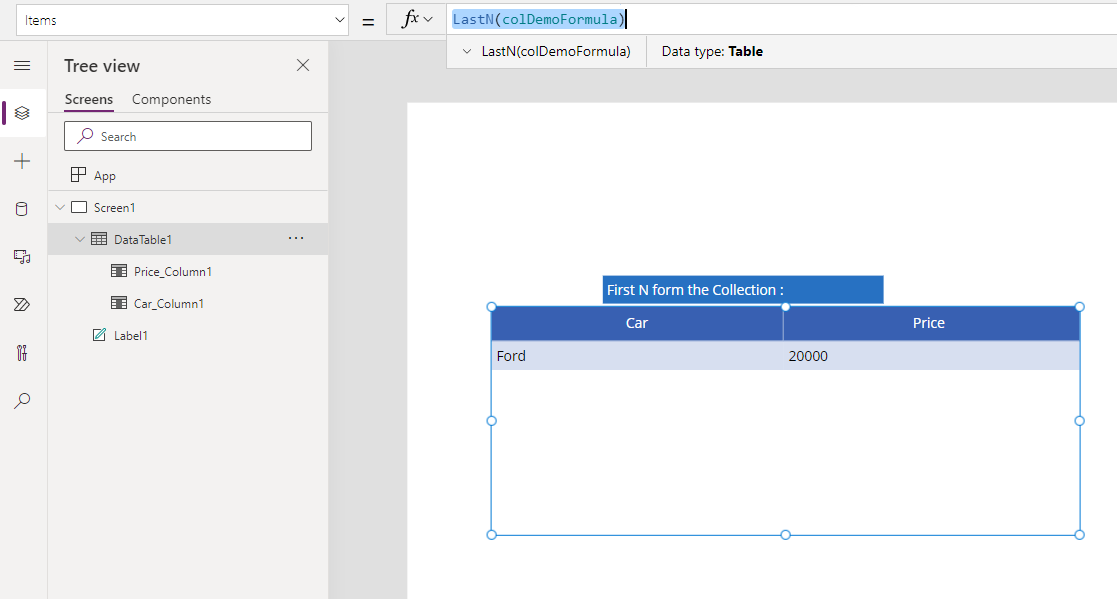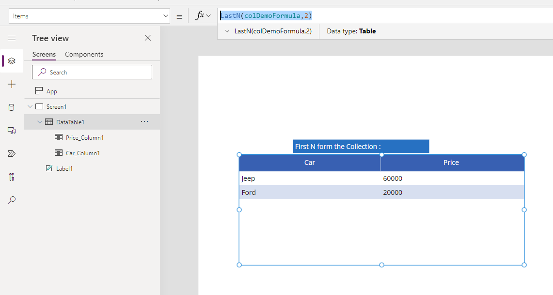 The LastN function returns the first set of records of a table; the second argument specifies the number of records to return.
