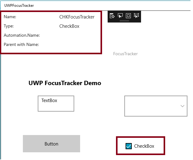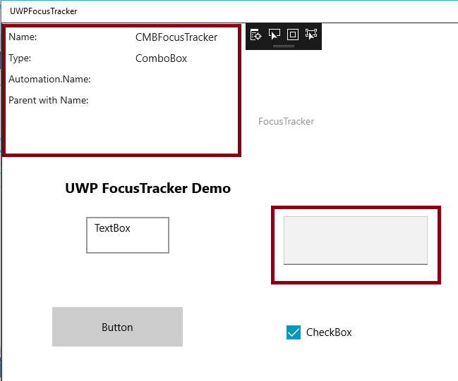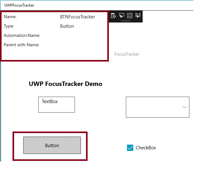 The FocusTracker Control can be used to display information about the currently focused XAML element. FocusTracker will display the following information (when available) about the current focused XAML element Name, Type, AutomationProperties.Name and name of the first parent in the hierarchy with a name.