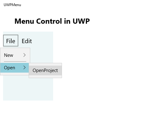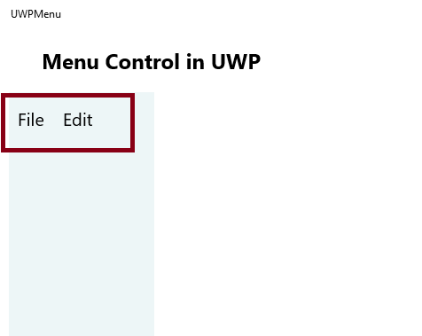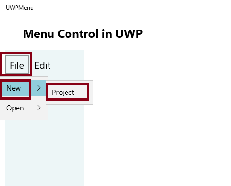 Add the MenuControl with namespace and two Menu Items File and Edit with MenuFlyoutSubItem