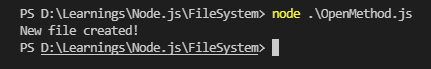 Let’s try to create a blank file using the open method of the fs module of Node.js.
