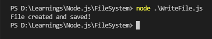 For details of the fs.writeFile() function please refer to create file section. Looking at an example of fs.writeFile() function: