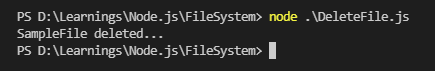 To delete files using Node.js, we can use the method fs.unlink(). This function is used to remove a file, it doesn’t work on deleting directories. To delete directories we can use the method fs.rmdir().