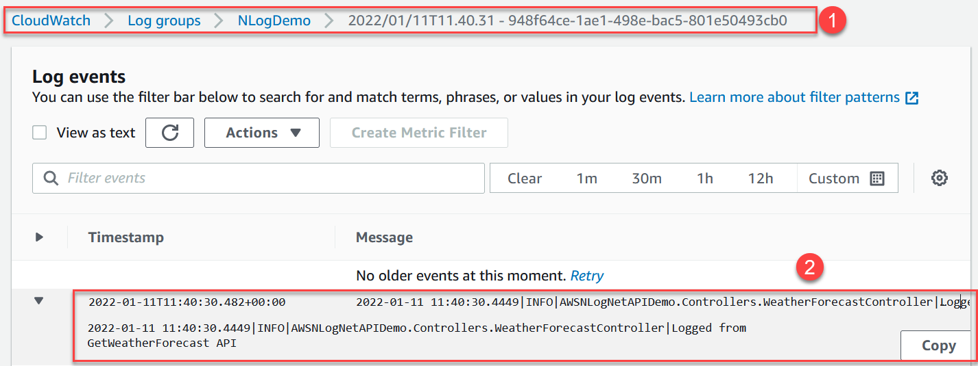 Step 2 - Open AWS Console, select the region (mentioned in the NLog.config) and navigate to Amazon CloudWatch service. In the left navigation, click expand Logs -> Log Groups. You can see the newly created log group and logs as shown below.