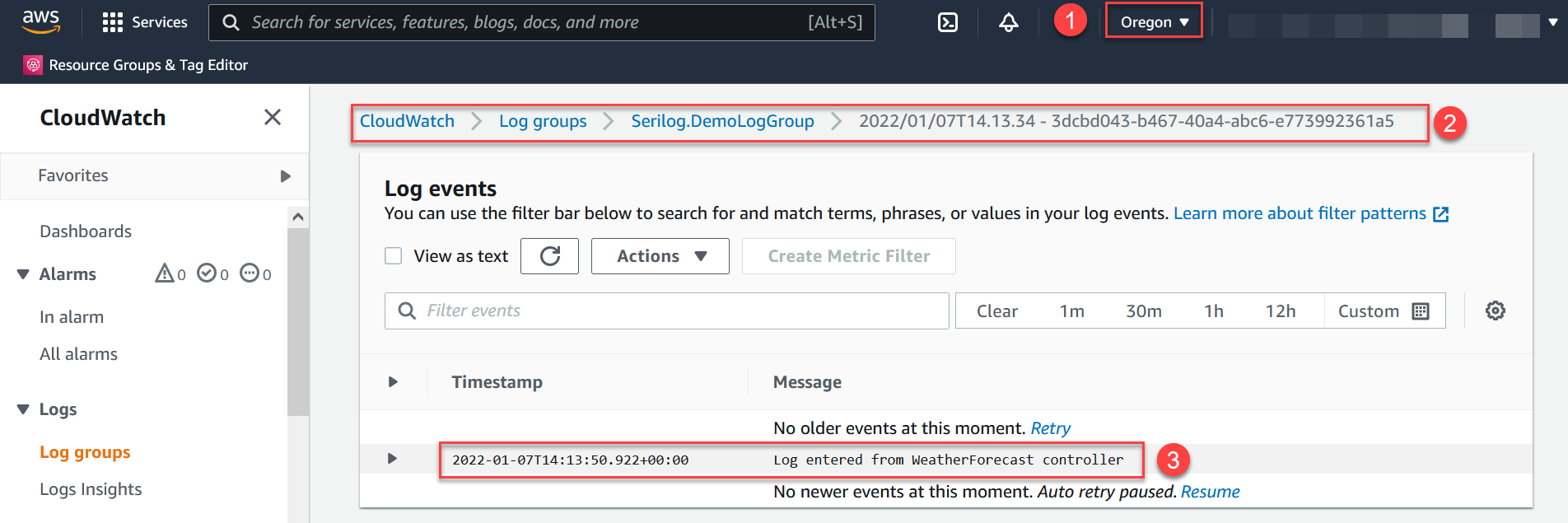 Step 2 - Open AWS Console, select the region (mentioned in the code) and navigate to Amazon CloudWatch service. In the left navigation, click expand Logs -> Log Groups. You can see the newly created log group and logs as shown below.