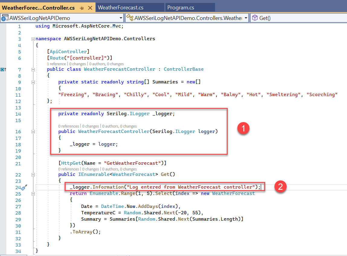 Step 7 - Open WeatherForecastController.cs file and add the logging code as shown below.
