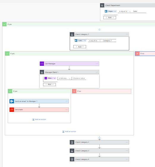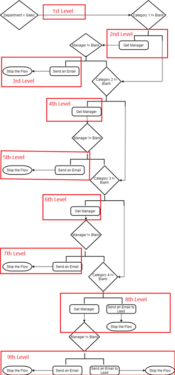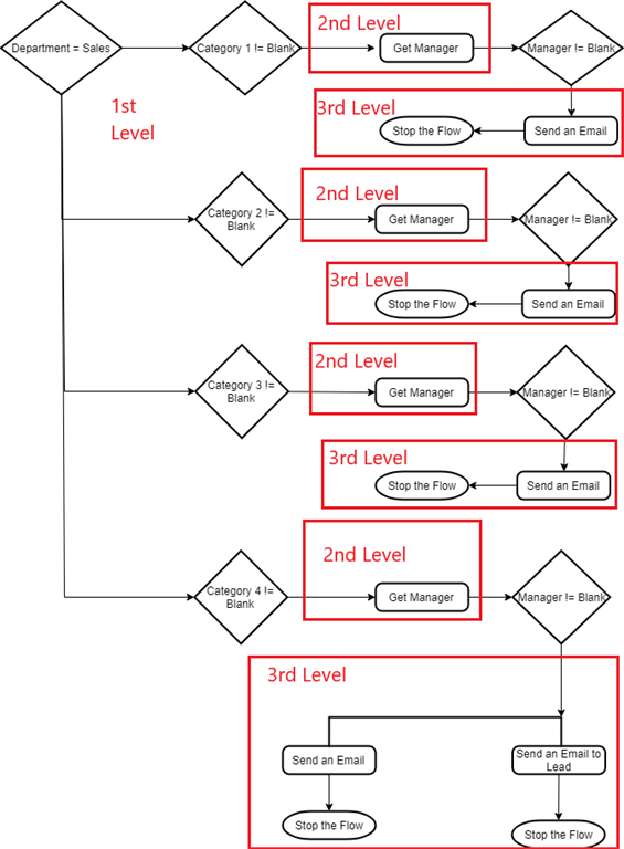 If we do not add any action, our Flow will return back to the upper level so in our case it will return back to 1st Level and there we will check for the value of Category 2 and repeat these actions until we get the manager. If we don’t get the manager even from Category 4, we need to send an email to the Lead of the Sales Department.