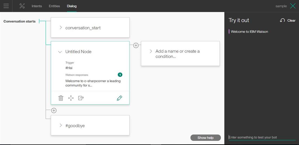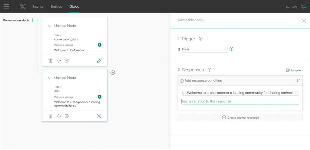Now, click + button to add new dialog conversation. Here, we need to use Trigger as a configured intent, so my intent name is Hai and Watson response is “Welcome to c-sharpcorner a leading community for sharing technology”.
