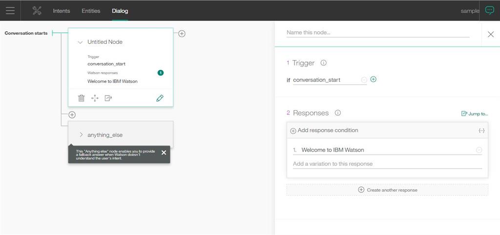 Response – Message was given to the user when displaying the conversation is triggered. Here, I am using a response message as Welcome to IBM Watson.