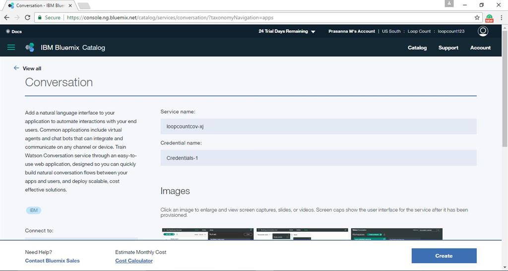In IBM Dashboard, click on Catalog from catalog scroll down, find Watson Services and select Conversation from Watson Services.