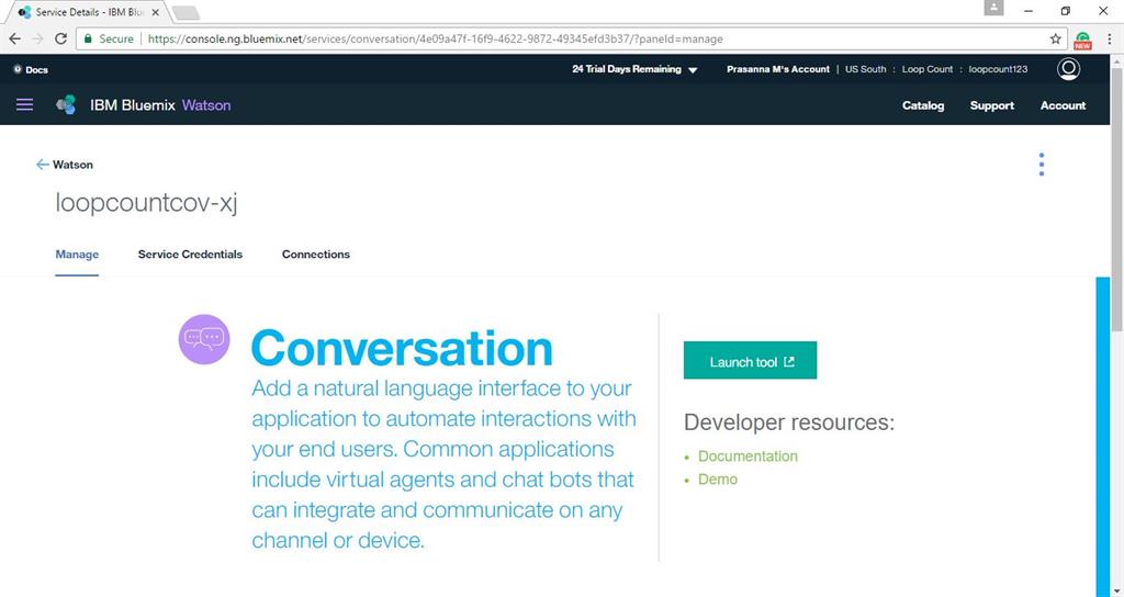 Now, our IBM Bluemix Watson Web Application is created successfully. From Conversations dashboard, click on Launch tool option to start configuring conversation.