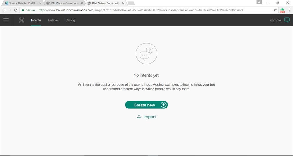 Now, we will be navigated to create Intents page. Click Create new to create new intents.