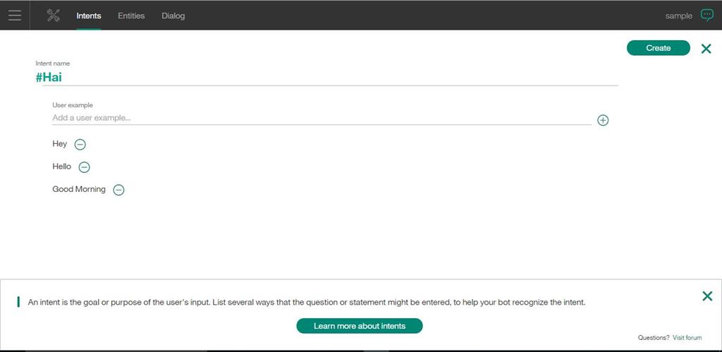 To add more intent example values, click + button to add the user value to provide more value. Once intent configuration is successful, then click create a button to create Hai intent, as shown below.