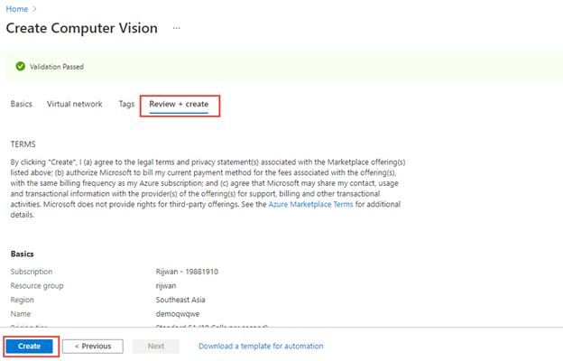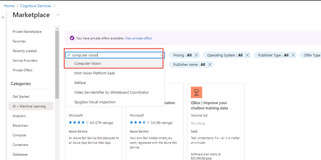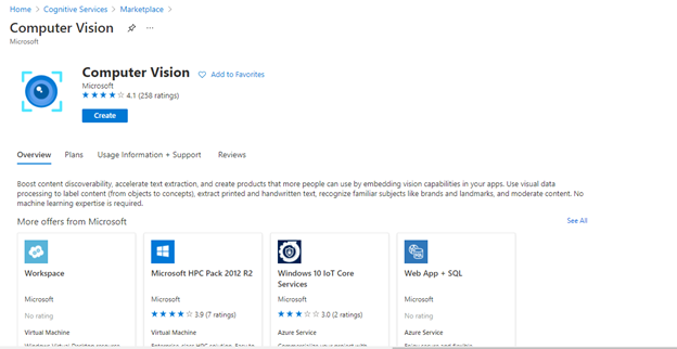 Create a new cognitive service, then it will display the marketplace. Simply we can search computer vision and select it.