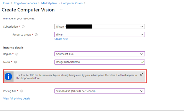 There is free tier as well for development which you will get in pricing tier, however, in my case, I have already utilized free in another demo. Therefore, I will choose standard one.