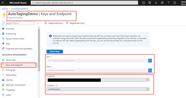 Most importantly, we need to get subscription key and endpoint for accessing this computer vision service/API. We can navigate to keys and endpoint tab get the required information as illustrated.