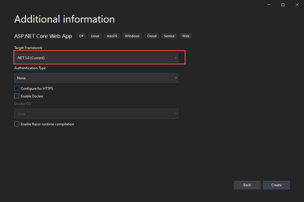 Then, we will get option to select the target framework. Here, we will select .NET 5.0 which is a current version.