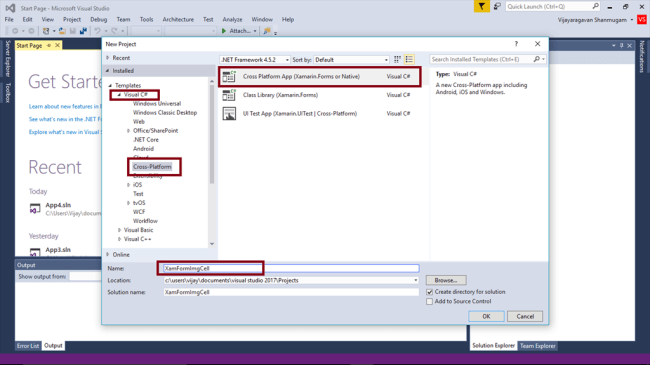Open Visual Studio 2017 RC. Go to Start -> New Project-> Cross-Platform (under Visual C#->Cross Platform App) -> Give suitable name for your App (XamFormImgCell) -> OK.