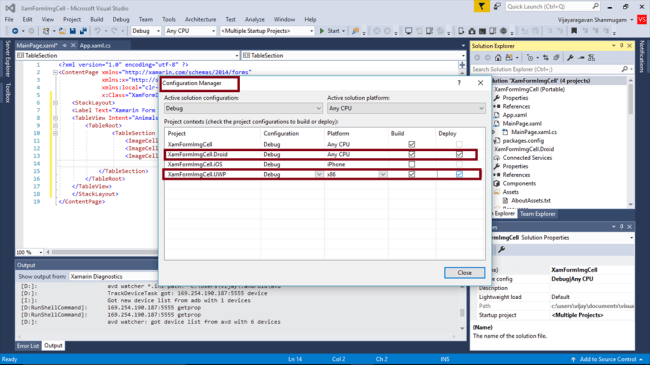 We will test Android and UWP. So, we can set the multiple Startup Projects as XamFormImgCell.Droid and XamFormImgCell.UWP (Universal Windows).