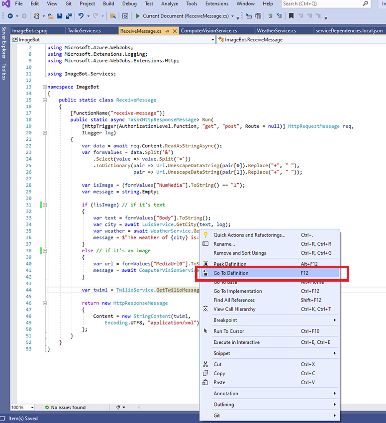 The Twilio message is received through TwilioService.cs and is obtained via the GetTwilioMessage call.