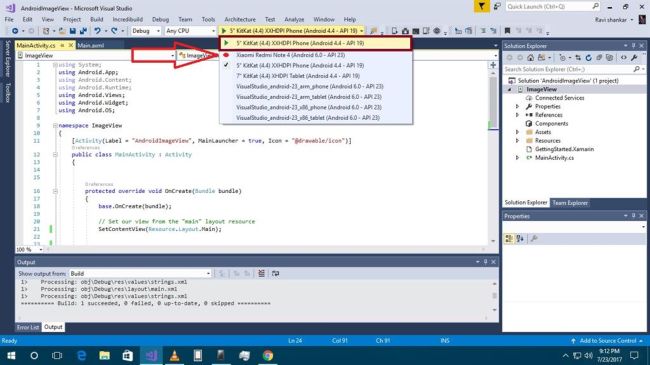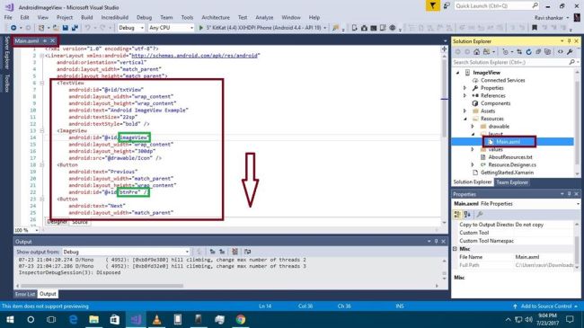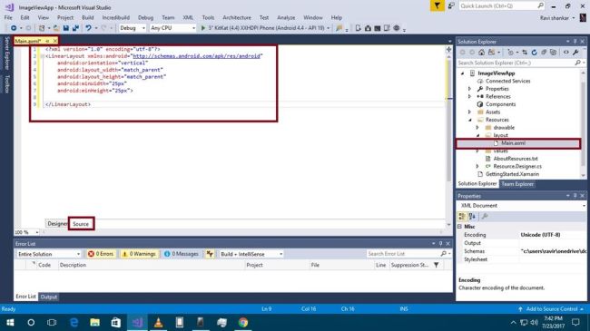 After the process completes, the Xamarin dashboard appears. At the top right, you will see Solution Explorer. There is your application solution. Select application name; extract to resources. The Layout folder appears in which there is Main.axml* file. Double click to open Main.axml file. Then double click on down side left corner appear Source button. Don’t change android version default V23.