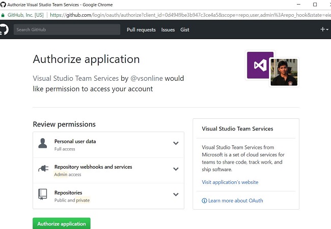 Give the repository type as GitHub and click Manage it. It will authorize you to access your GitHub repository from VSTS, once the authorization is done. Now, we need to add he task, which is used to build our Application.