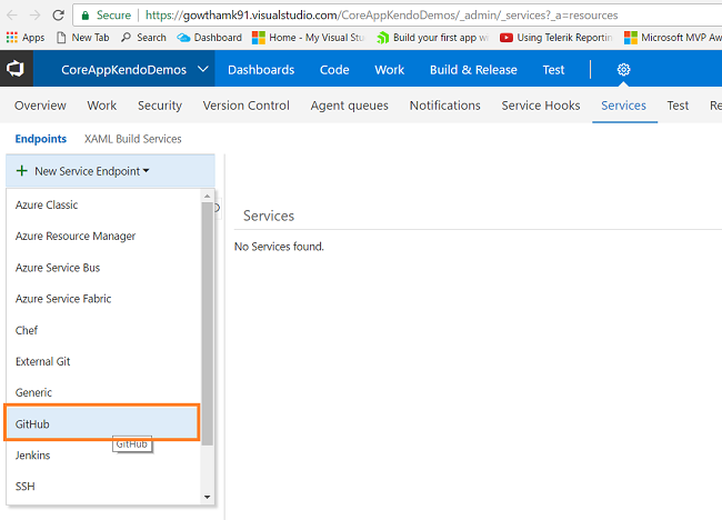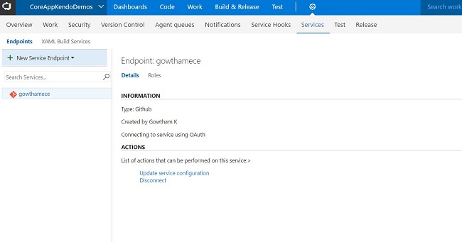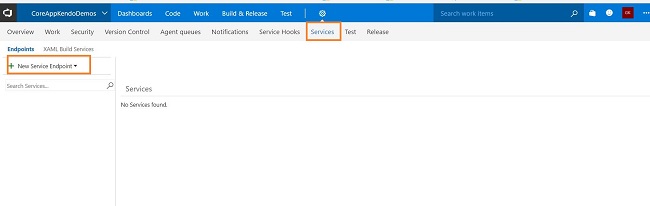 Now, let’s create a new Endpoint Service, using this existing CoreAppKendoDemos project in VSTS; just go to Service of the project, as shown below.