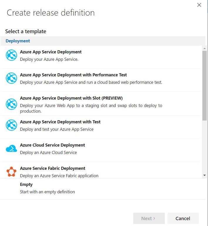 The create release definition window will be opened with a list of deployment templates. Let's select Azure App Service Deployment and click Next.