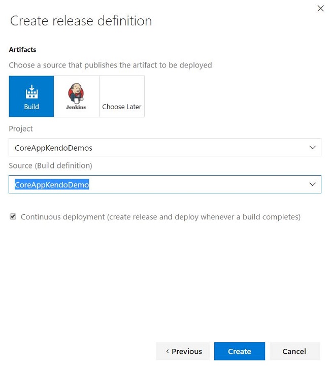 Choose the respective project and build the definition; followed by checking on continous deployment. Click Create to open the release definition page, as shown below.