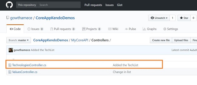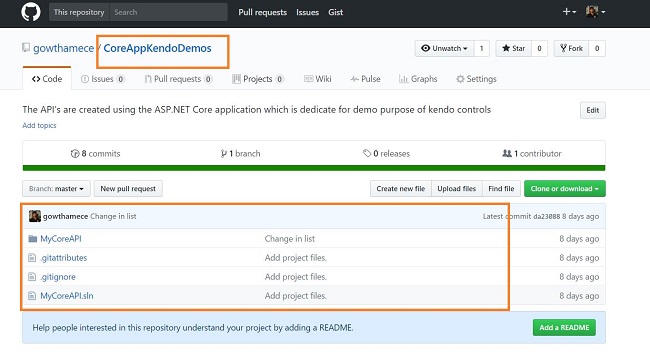 One of my GitHub repositories (https://github.com/gowthamece/CoreAppKendoDemos) consists of ASP.NET Core API Application, as shown below.