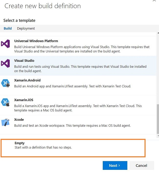 A new create build definition Window will be opened with some list of predefined templates. Since we are working on an ASP.NET Core API site, I am going to select an Empty Template. Click Next to change the settings.