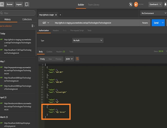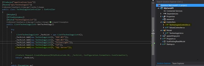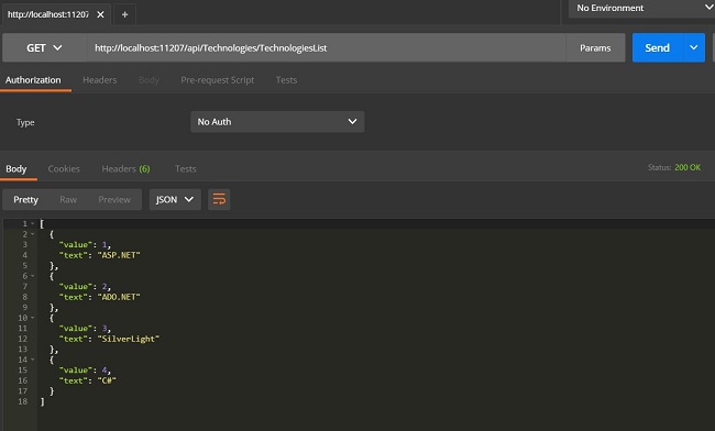 My ASP.NET Core API is capable of giving a technology list as a GET response, as shown below.