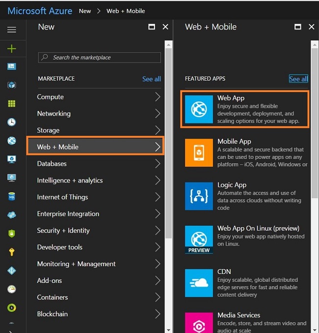 Log into your Azure portal. Quickly create a new Web app (New -> Web+Mobile -> Web app), as shown below.