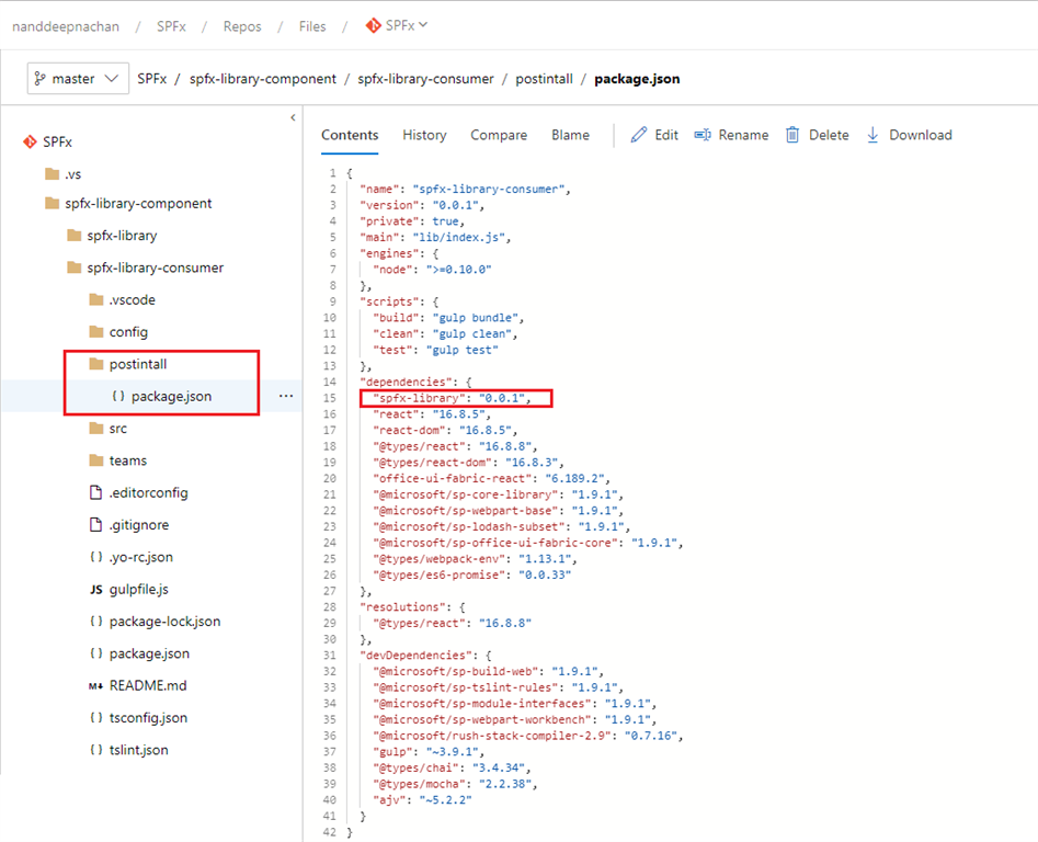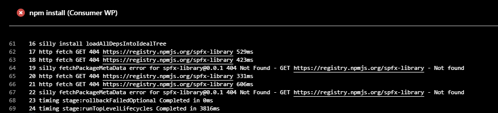 - However, if we specify the library dependency in pakage.json, during the build it will try to get the package from npm as “GET https://registry.npmjs.org/spfx-library” and the build will fail.