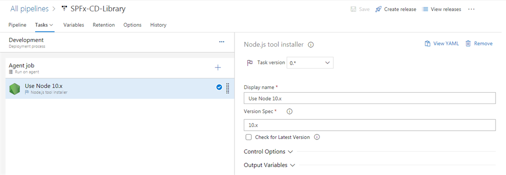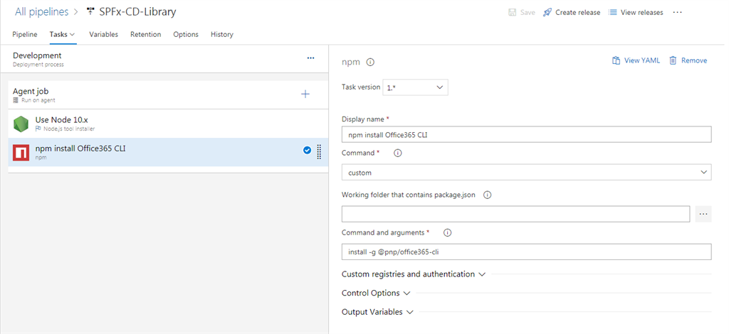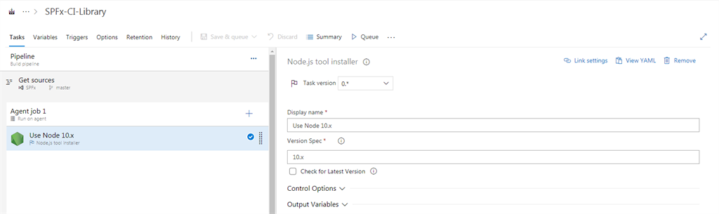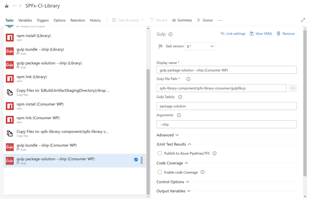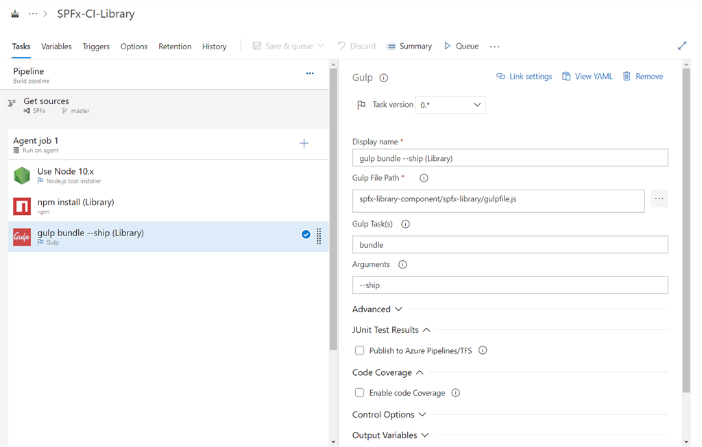 We will independently install npm packages, bundle, and package the library and web part. To achieve continuous build, create a build definition and add below steps to it.