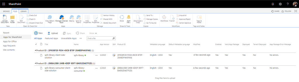 - Deploy spfx-library package in the tenant app catalog (tenant wide).
