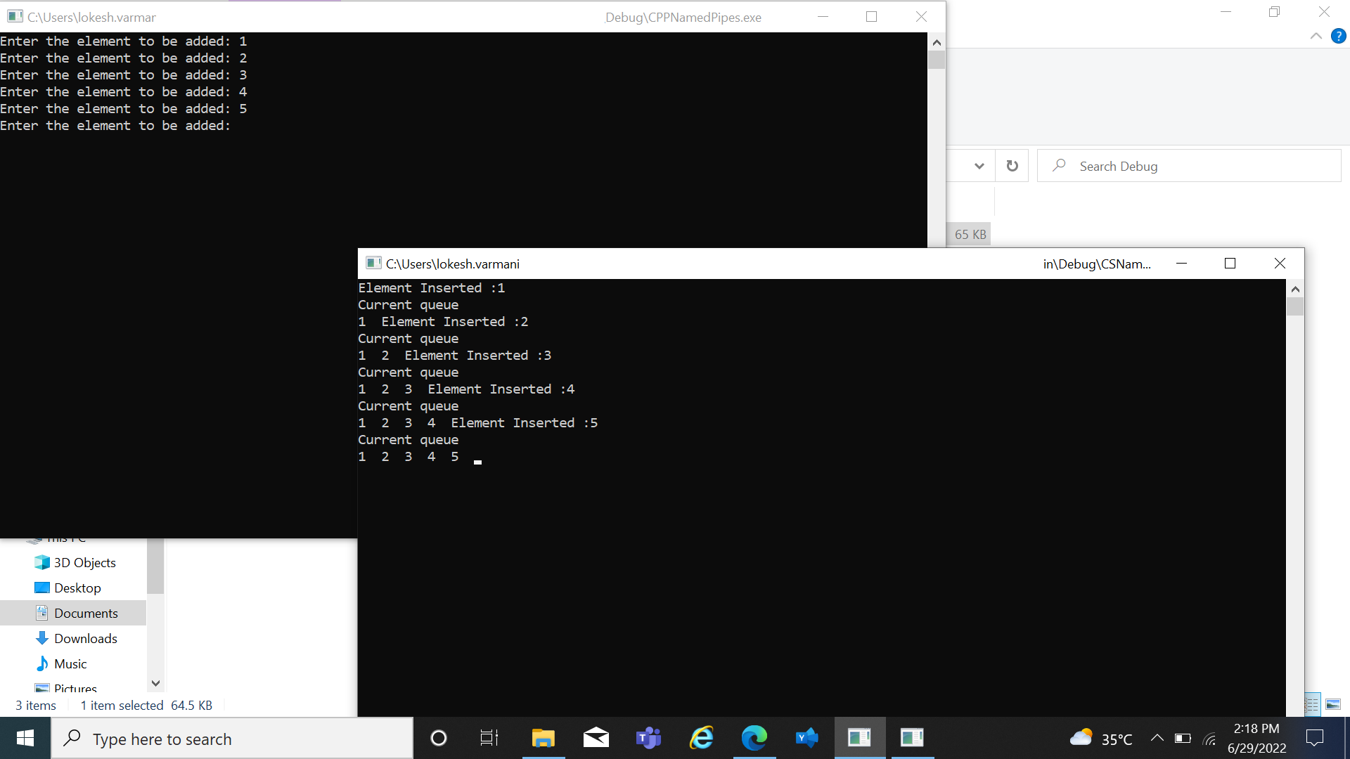 The below image shows that elements are being sent from a C++ process and it gets captured and stored in a queue using the named pipes in a C# Process.