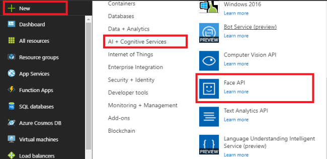 Step 2Press "+New", then choose "AI + cognitive services", and select "Face API".