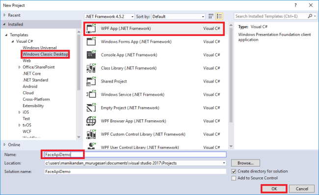 - Creating the WPF Application using the Face API in Visual Studio 2017.