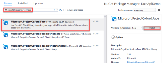 And also, browse for the Microsoft.ProjectOxford.Face and press "Install". This package is used to configure the Face API and our application through the HTTPS request. Thus, it imports a .NET library that encapsulates the Face API REST requests.