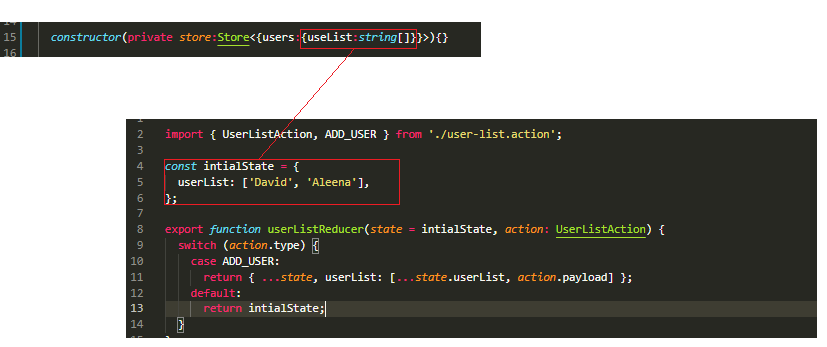 Here we are specifying that the type of data from the store area we require in this app component is an object with key userList and its value is a string array.