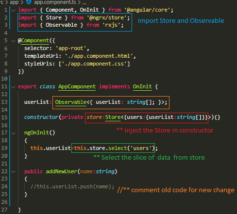 Now, Add this.store.dispatch(new UserListAction(name) ) statement inside the button click event method ‘addNewUser()’