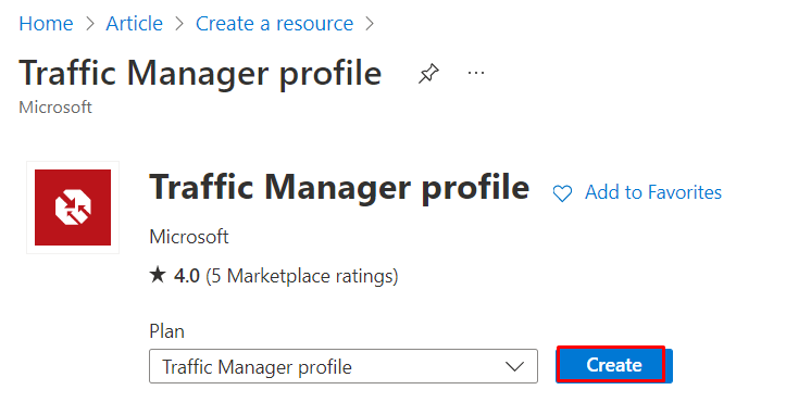 On the Azure Portal, Click + Create, and in the search bar, type Traffic Manager Profile. Then, select Traffic Manager Profile, and click Create.