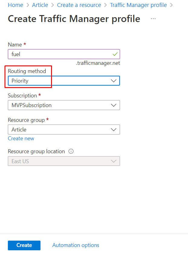 Enter the name for Traffic Manager, select the routing method as Priority, and then click Create.