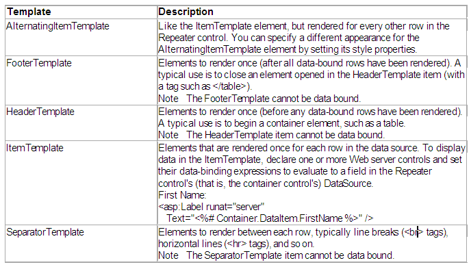 To create a basic templated data-bound list, use the Repeater control. The Repeater control does not have any built-in layout or styles therefore we must explicitly declare all HTML layouts, formatting, and style tags within the control's templates. For instance, you can declare the <table> tag in the HeaderTemplate, a table row (<tr> tags, <td> tags, and data-bound items) in the ItemTemplate, and the </table> tag in the FooterTemplate, to create a list within an HTML table.