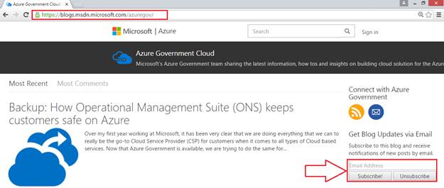 To see what is currently happening with Azure Government and to receive emails go to Azure Government Blog and select “Subscribe by Email”. For further details you can follow the below screenshot.
