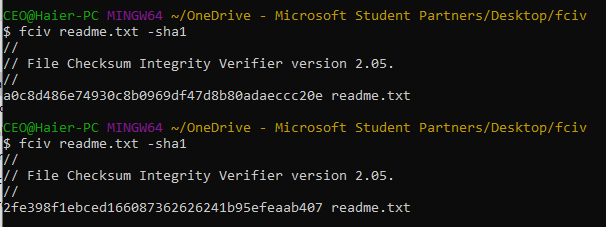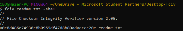 fciv "filename with the extension" hashing algorithm => fciv readme.txt -sha1