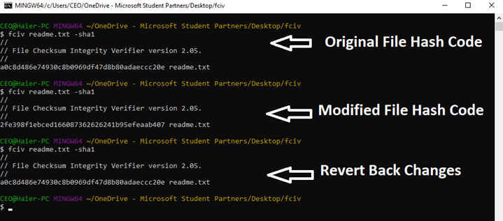 Here, you can see the Hash Code has been changed. This shows that the file has been modified and no longer in its original form. If we revert the changes that we made in the file and again apply the hashing technique, let's see what happens.
