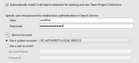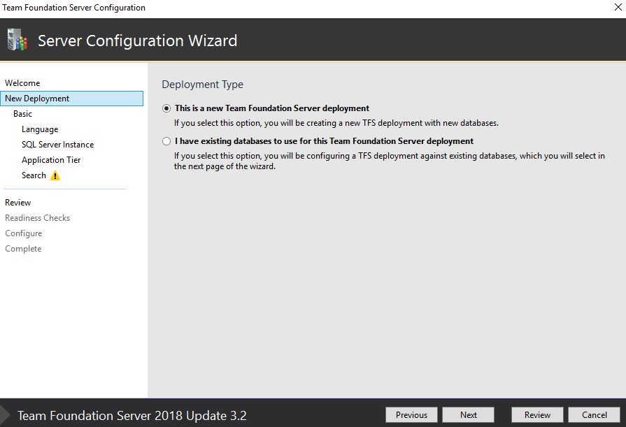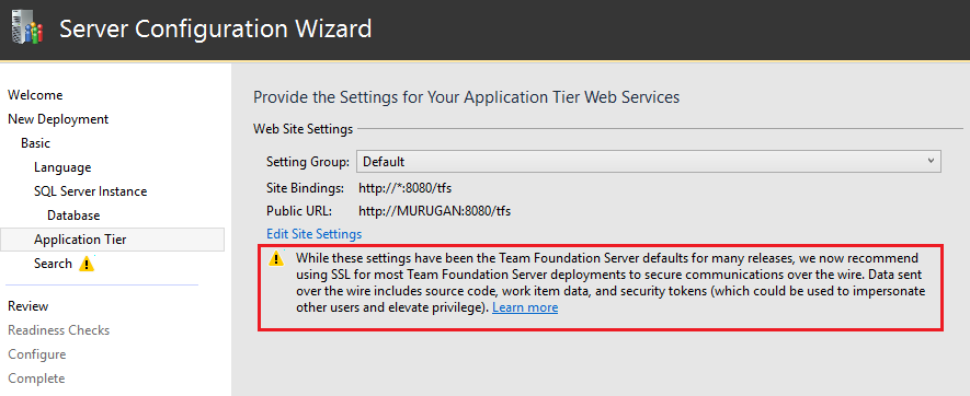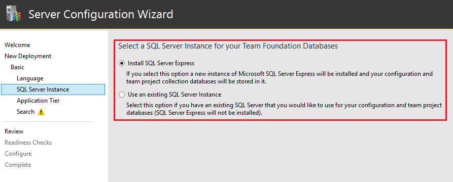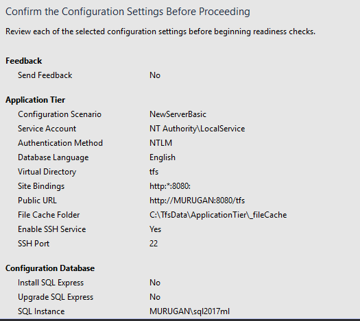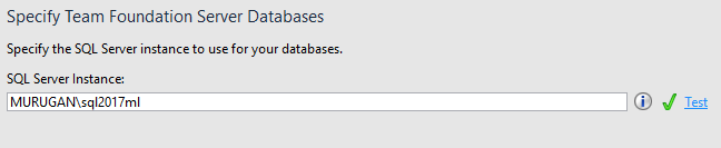 We can choose the SQL Server instance. Please note that any TFS version needs a SQL Server to keep their data. As I have already installed SQL Server on my machine, I am choosing the second option.