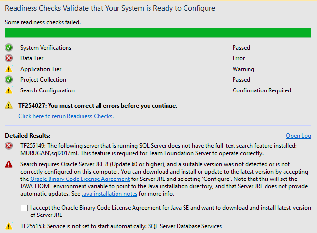 Our validation has failed. Here, you need to note that I have chosen Search Service already. Search Service needs some additional features in SQL Server like full-text search feature and Java Runtime 8 version. Hence, I am removing the Search service option and running the readiness check again.