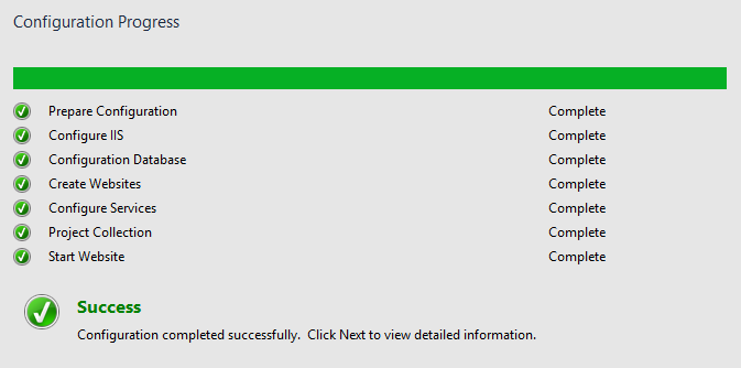 Click the “Configure” button now and start configuration. It will take several minutes to finish the entire configuration. After some time, a new database “Tfs_Configuration” is added to our SQL Server instance.